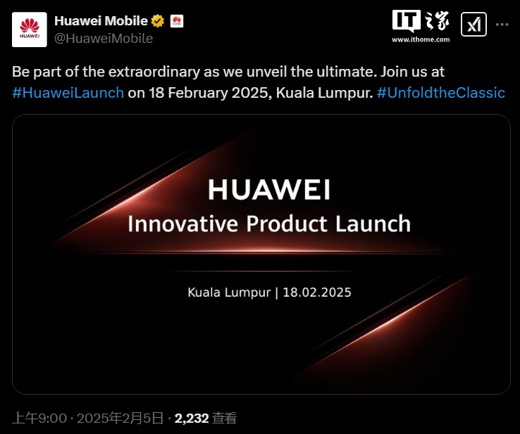 IT之家 2 月 5 日消息,华为手机今日官宣,将于 2 月 18 日在马来西亚吉隆坡举行海外发布会。