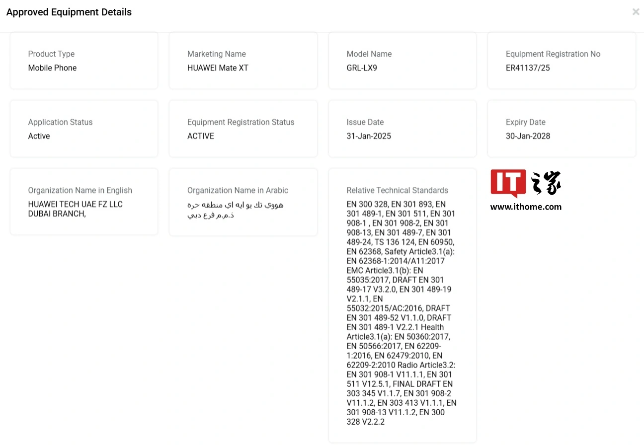 据IT之家此前报道,上月底,华为 Mate XT 三折叠手机通过阿联酋 TDRA 认证,该设备的型号为 GRL-LX9(国内型号为 GRL-AL10)、注册号为 ER41137/25。