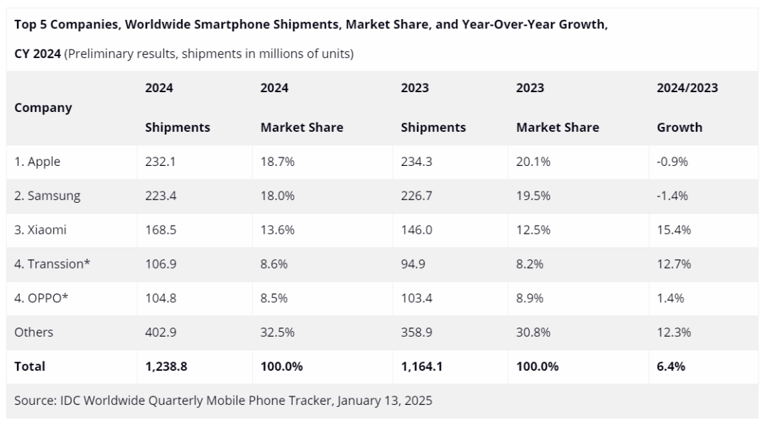 不过IT之家注意到,华为智能手机在全球市场还有待复苏,IDC 的 2024 年全球智能手机市场报告中,华为未能进入全球智能手机市场出货量前五名。