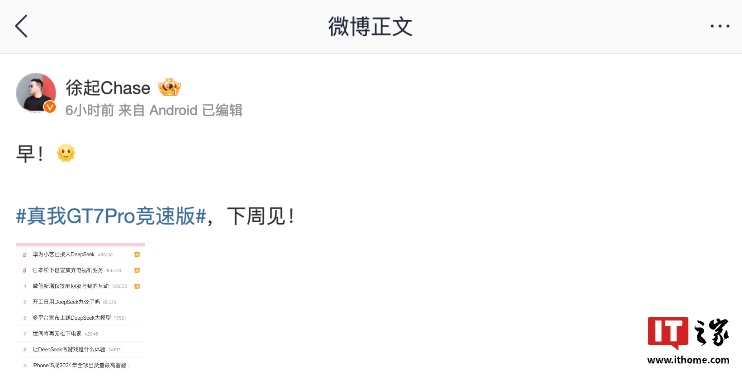 IT之家 2 月 6 日消息,真我 realme 副总裁、全球营销总裁、中国区总裁徐起今日早发文宣布,真我 GT7 Pro 竞速版手机“下周见”。