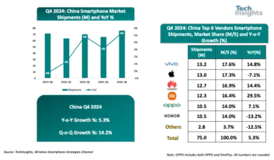 文章来源于互联网:IT之家-TechInsights:2024 年 Q4 中国智能手机出货量 7500 万,连续四个季度同比增长
