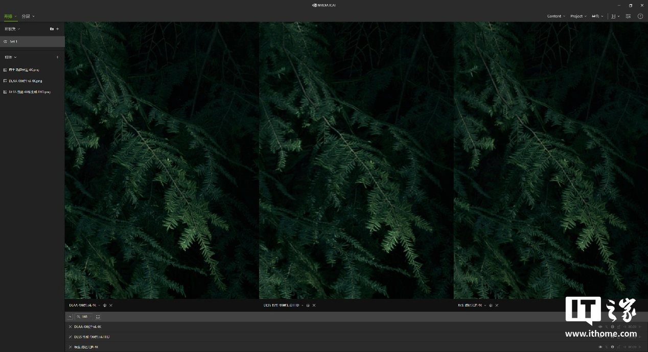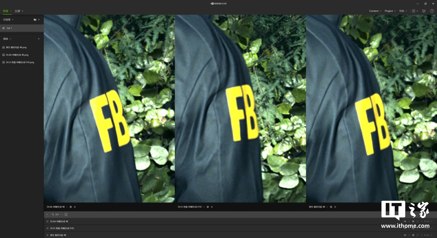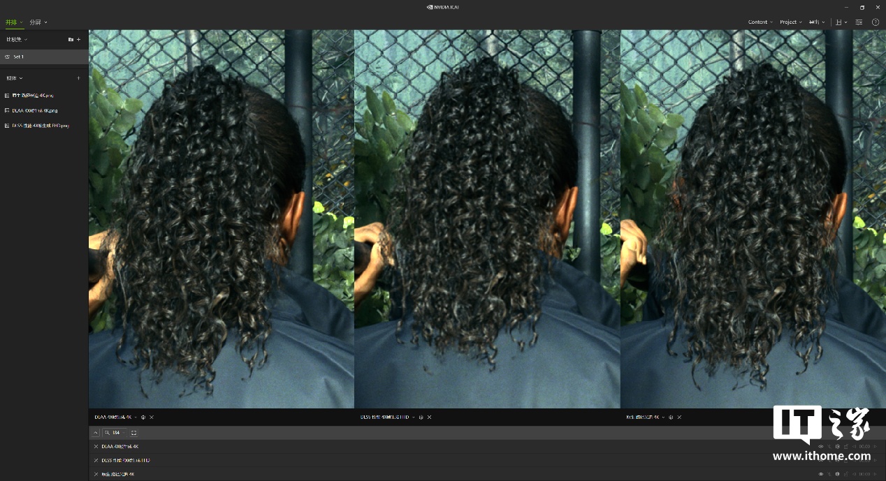 然后通过 NVIDIA ICAT 工具进行比较,在不放大的情况下 3 者根本看不出区别,所以我们挑选了 3 处细节进行放大对比。