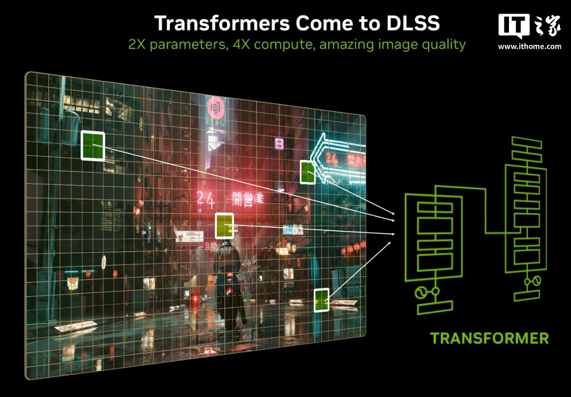 DLSS 4 技术还带来了模型架构的重大升级,DLSS 光线重建、DLSS 超分辨率和 DLAA 特性均由首个实时 Transformer 模型驱动,并用来提升生成像素的质量,它支持通过自注意力操作评估整个帧几多个帧中每个像素的重要程度,更好理解场景关系,让生成的像素具有更好稳定性、更少的伪影、更丰富的运动细节和平滑边缘。