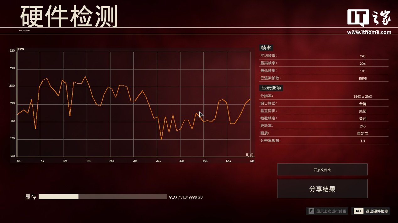 在 2K 分辨率 + 影视级画质 + 50% 超采样分辨率 + 高全景光追 + 帧生成下,游戏平均帧数为 178 帧;