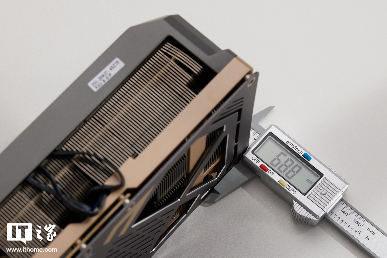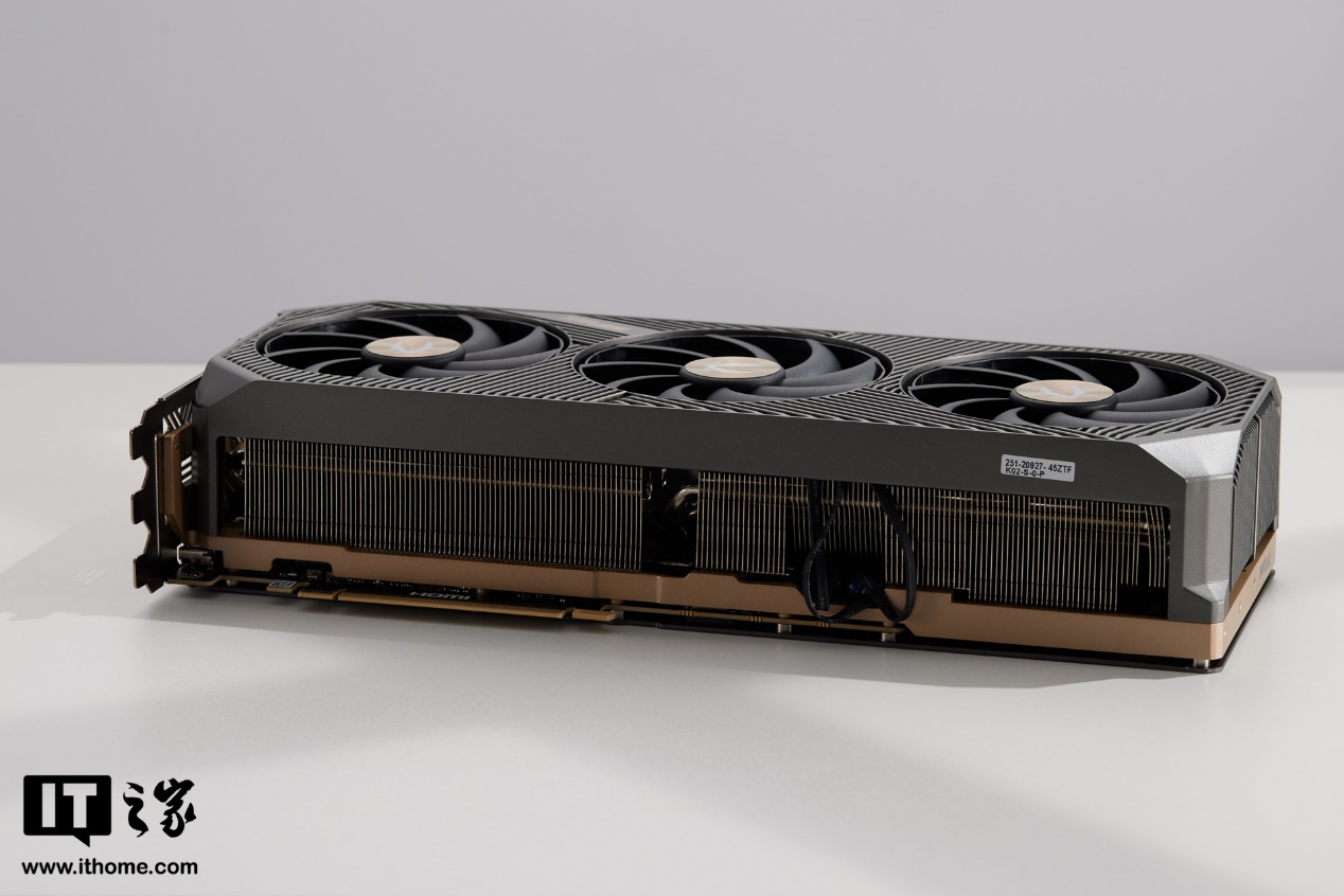 透过镂空开孔,能够看到卡身内部厚实的散热格栅,还有看不到的巨型 VC 均热板和镀镍符合热管加持,通过贯穿是散热设计,让风吹透鳍片,达到全方位立体散热效果。