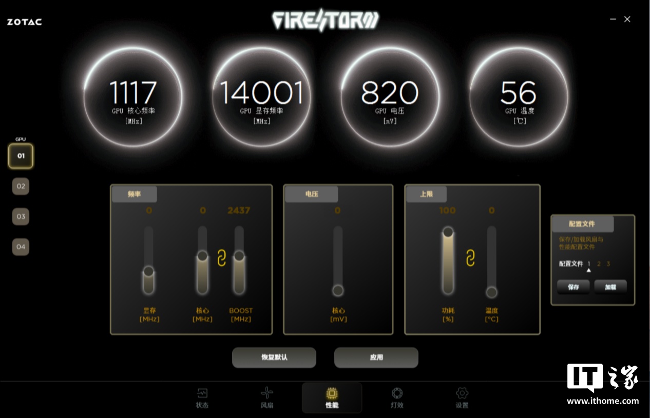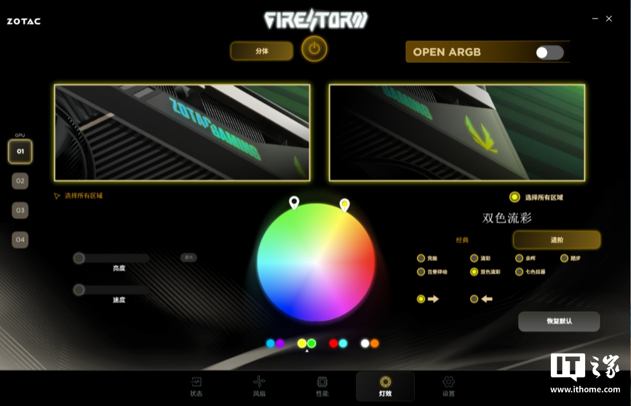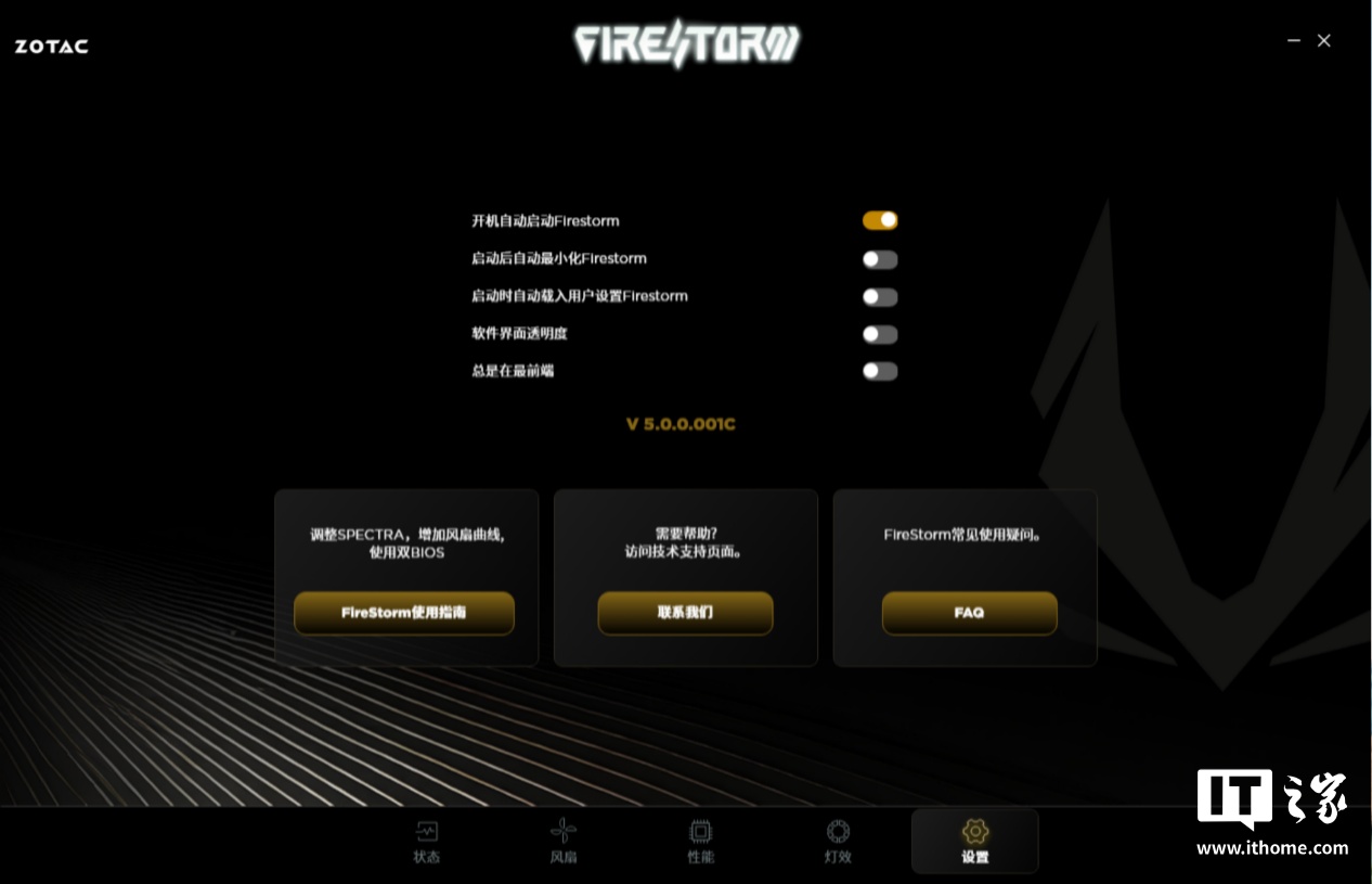 此外,FireStorm 应用还给到了用户更加全面的显卡信息展示和灯效控制,设置标签中还允许用户进行界面的一些人性化设置。具体的功能大家可以在购买索泰 50 系显卡后自行体验,这里就不展开了。IT之家拿到的版本是 5.0.0.001C,官网正式版的 FireStorm 版本号可能会与我们有所区别。