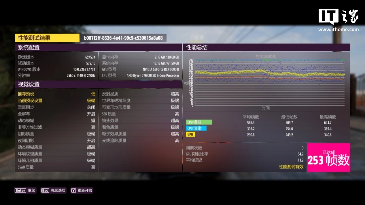 在 2K 分辨率 + 极端画质下,游戏平均帧数为 253 帧,1% Low 帧 105 帧;