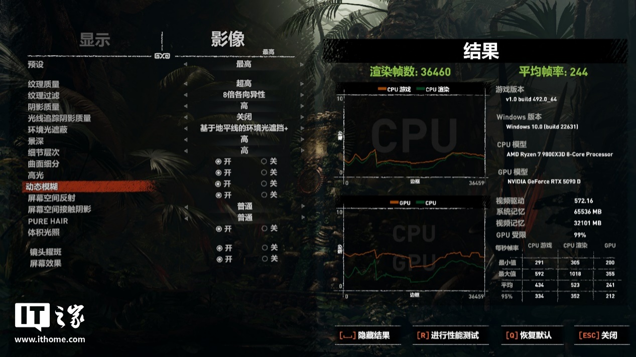在 4K 分辨率 + 最高画质下,游戏平均帧数为 244 帧;