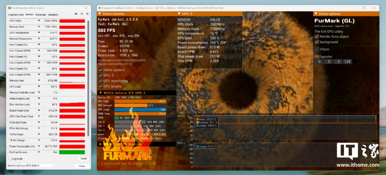先看烤机,单烤甜甜圈 20 分钟,GPU 的核心温度稳定在 75.9℃左右,显卡频率 2595MHz,功耗稳定在 575W 左右,和公版保持一致。