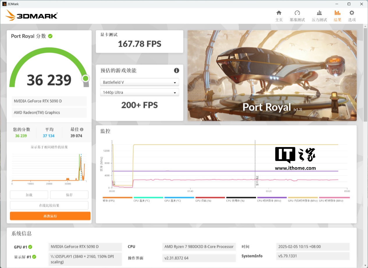 在 3DMark Portal Royal 实时光追测试中,索泰 GEFORCE RTX 5090 D 32GB SOLID OC 显卡的综合分为 36239 分,作为对比 GeForce RTX 4090 公版的分数为 25080 分,提升幅度达到了 44.5%。