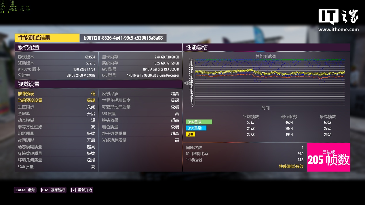 在 4K 分辨率 + 极端画质下,游戏平均帧数为 205 帧,1% Low 帧 102 帧;