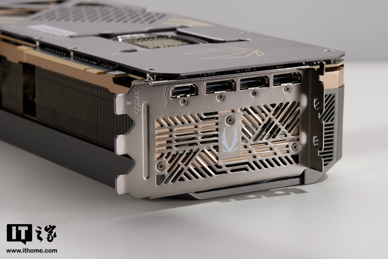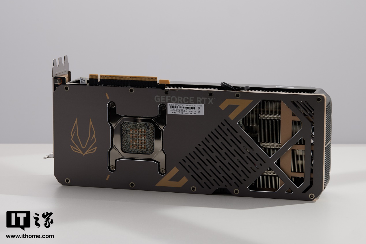 索泰 GEFORCE RTX 5090 D 32GB SOLID OC 显卡背板同样采用了硬核工业风的设计,右侧提供了大面积的斜切细条开孔和不规则镂空开孔,两种很少出现在一起的开孔设计相互碰撞,反而让背板显得更有特色。
