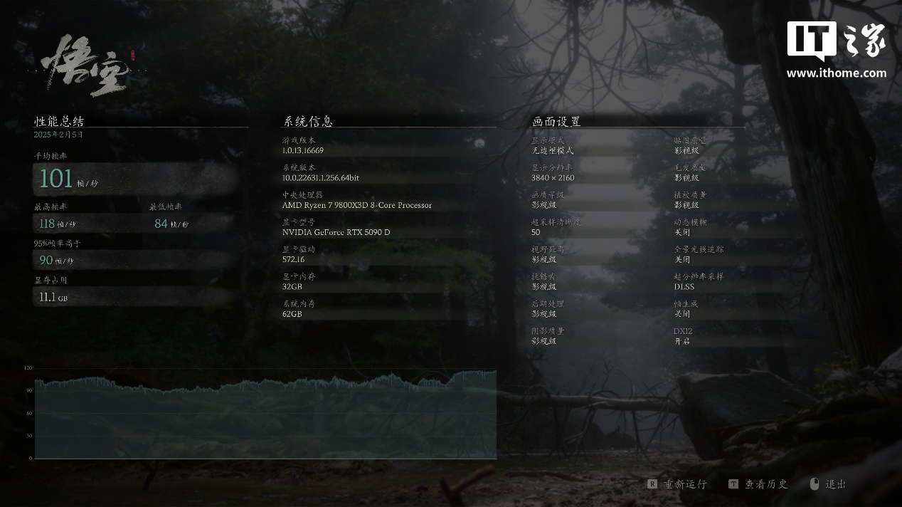 4K 分辨率 + 影视级画质 + 50% 超采样分辨率下,游戏平均帧数为 101 帧;