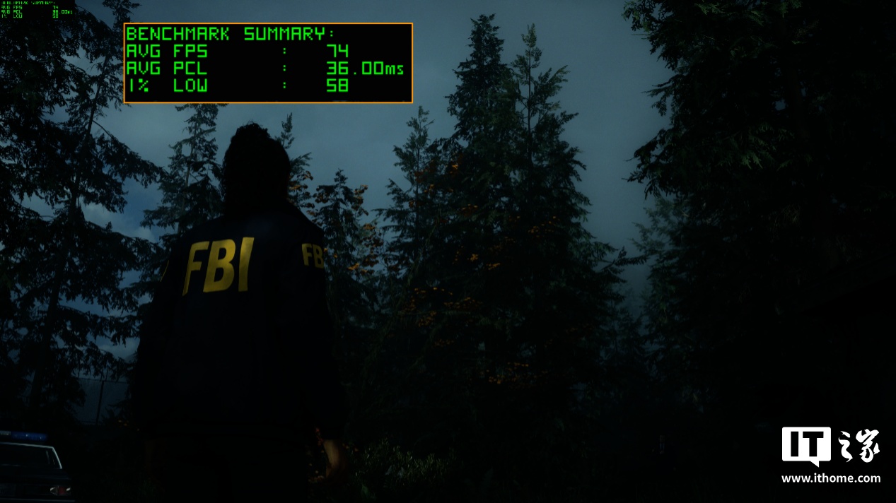 我们再来看《心灵杀手 2》的表现。在 4K 分辨率 + 原生最高画质下,游戏的平均帧数为 74 帧,注意此时游戏的延迟只有 36ms。