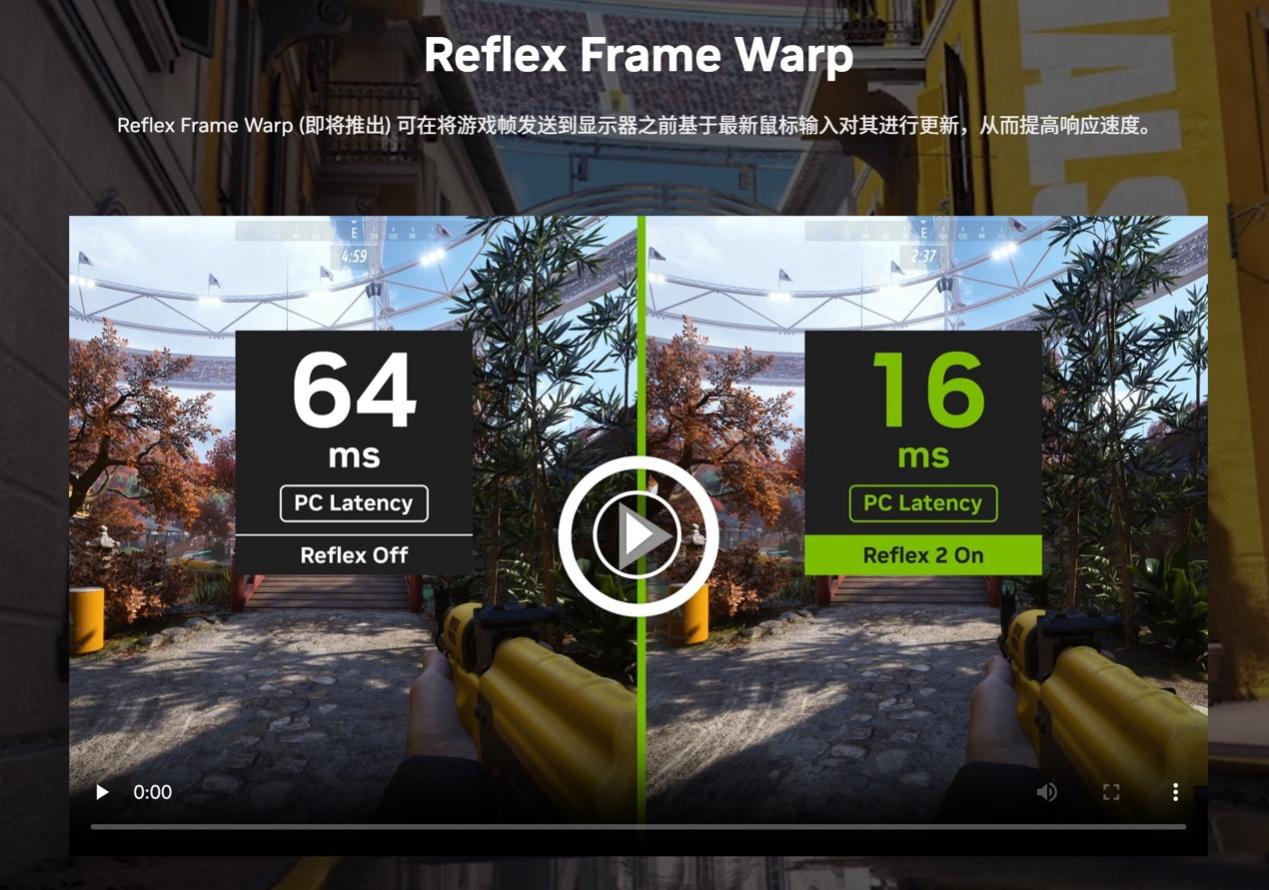 那说到延迟,新一代 NVIDIA Reflex 2 低延迟技术也可进一步降低游戏的延迟表现,提升操作手感和响应速度。过去四年里,NVIDIA Reflex 已集成到超过 100 款游戏中,可以将 PC 延迟降低 50%。新的 Reflex 2 将采用一项 Reflex Frame Warp 技术,通过把最新的鼠标输入指令及时同步给渲染帧,实时刷新和控制渲染出的游戏帧,可以说是定制化的低延迟调整了。