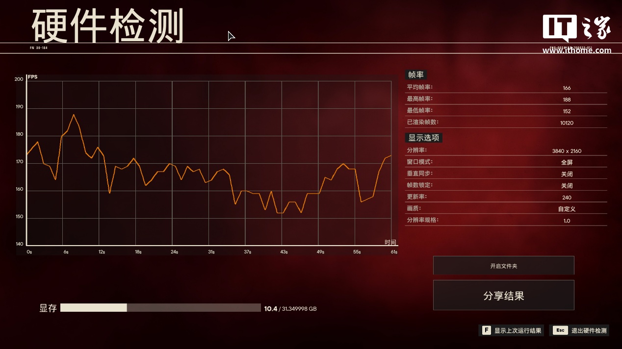在 4K 分辨率 + 极高画质 + 开启光追 + DLSS 质量下,游戏平均帧数为 166 帧,1% Low 帧 77 帧;