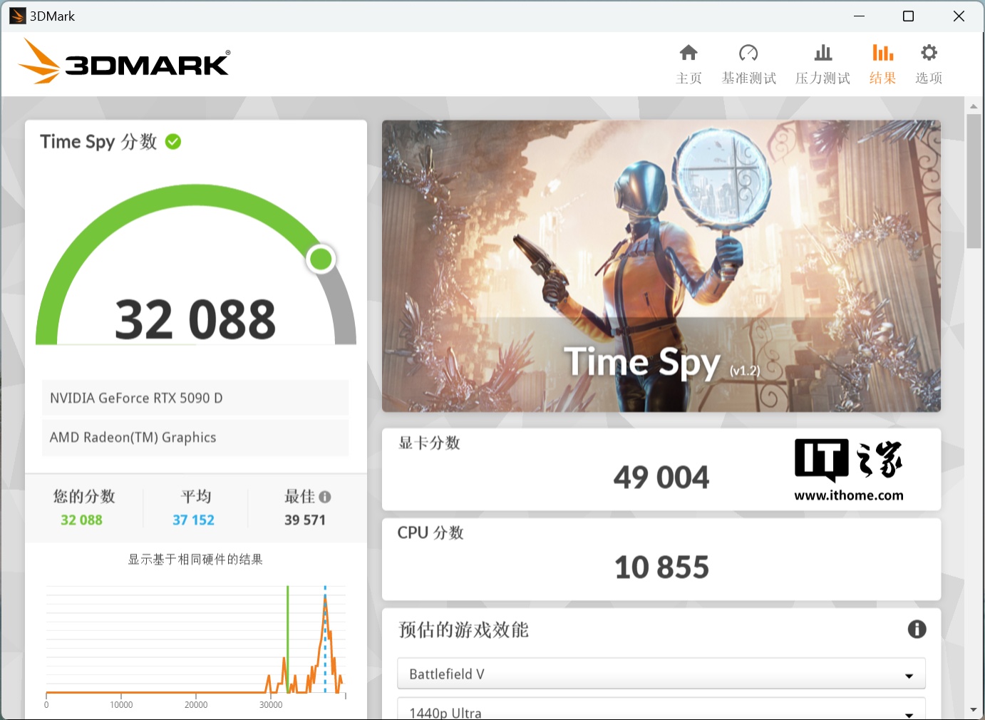 在 3DMark Time Spy DX12 测试中,索泰 GEFORCE RTX 5090 D 32GB SOLID OC 显卡分数达到了 49004 分,作为对比 GeForce RTX 4090 公版的分数为 34725 分,提升幅度达到了 41.1%,差距着实不小。