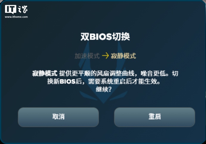 风扇标签页中提供了自动和手动风扇调节模式,也可以通过曲线模式更精细化调节风扇转速曲线。右侧还有外观部分提到的双 BIOS 切换开关,切换时会弹出提示弹窗,告诉用户当前模式状态及要切换的模式,确认切换模式则需要重启系统生效。