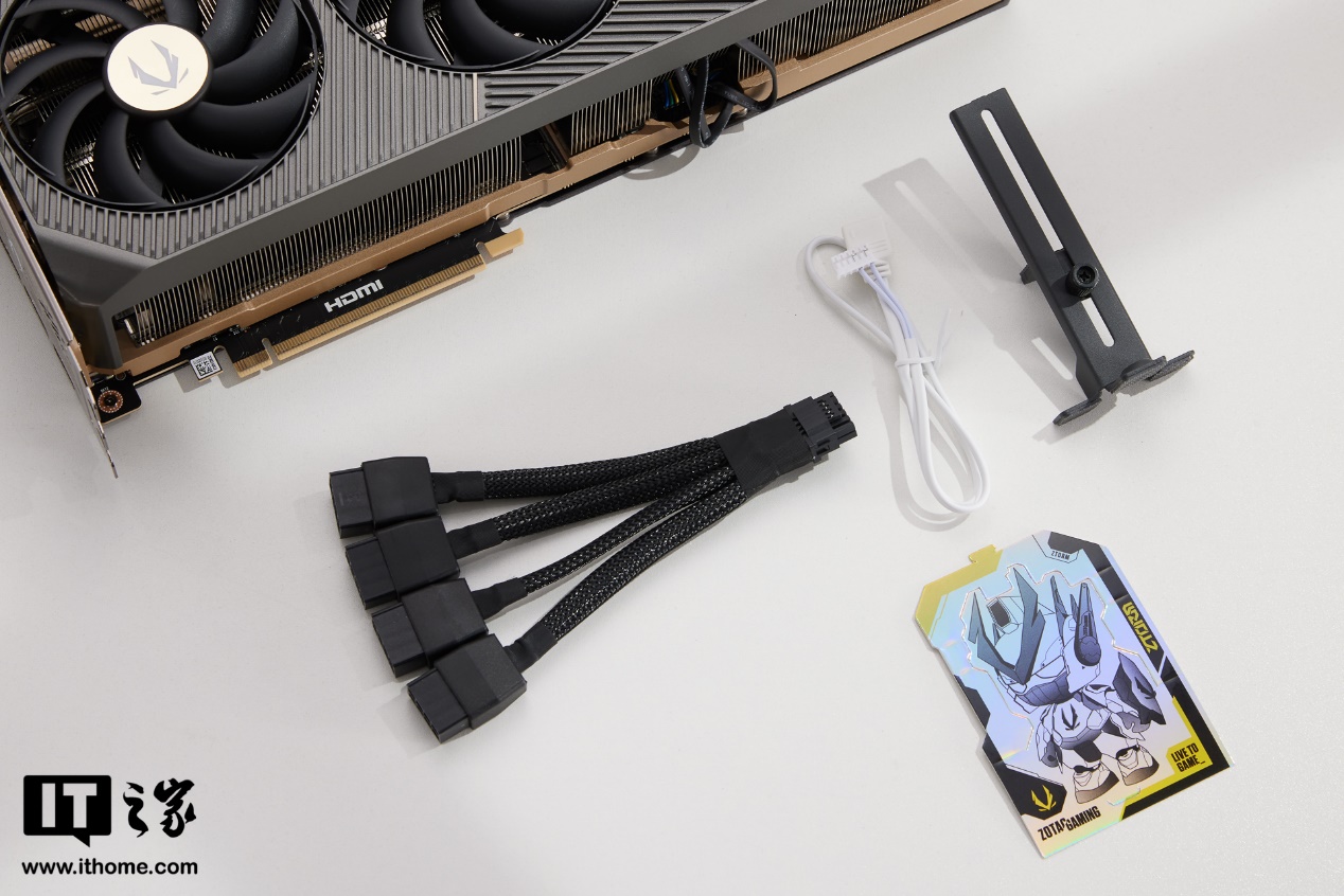 配件方面,包装内提供了一条 16pin 转 4*8pin 的供电转接线,幻光接口专属白色灯光线,可拆卸铝合金显卡支架以及一张彩色卡通形象卡片。