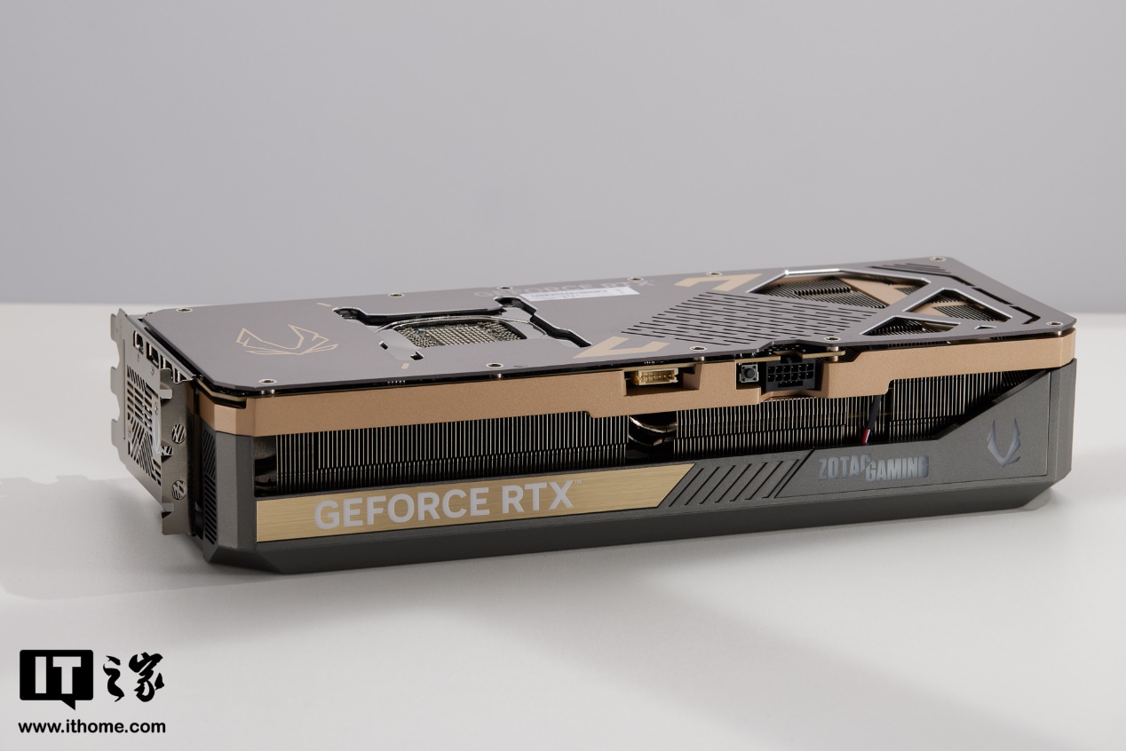 显卡两侧同样被厚实的散热装甲包裹,并且在靠近显卡背板的一侧做了一圈金色的铝合金加固条。顶部侧面镂空字符的 ZOTAC GAMING 标志和旁边的索泰 Logo 支持 RGB 灯效,亮机后可实现炫酷的多彩 RGB 效果。