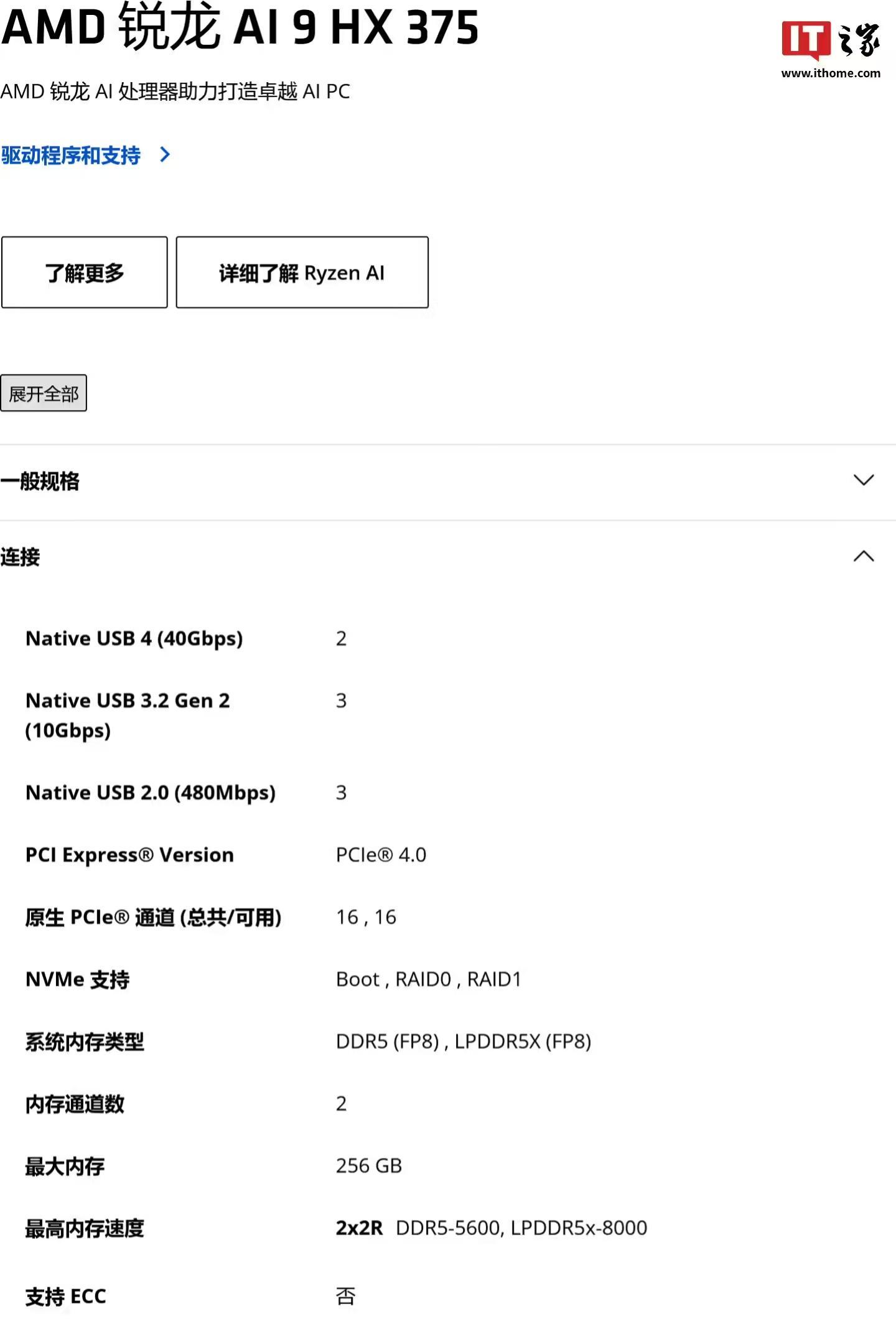 目前 AMD 官网上各款 “Strix Point” 处理器的最高内存速度规格都是 LPDDR5x-8000,而此前的所有 “Strix Point” + LPDDR5x 组合方案的最大内存容量都仅有 64GB。