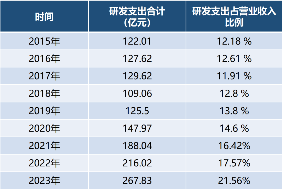 中兴在研发上的投入,远远超过行业平均水平。十年来,每年至少投入 100 多亿人民币,近几年甚至达到 200 多个亿。