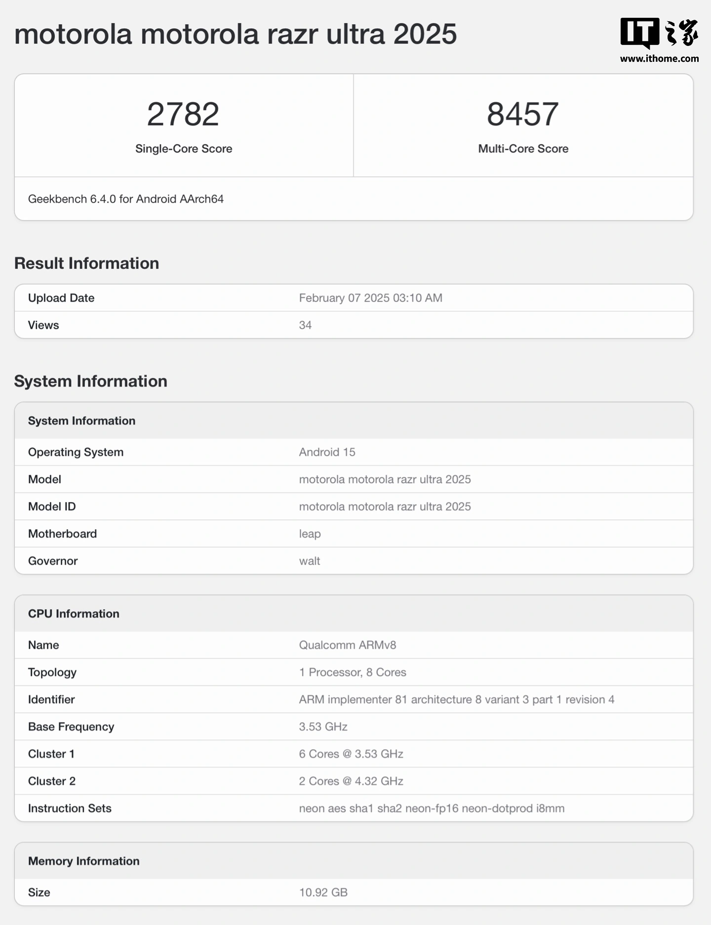 文章来源于互联网:IT之家-摩托罗拉 Razr Ultra 2025 小折叠手机现身 Geekbench 跑分库:骁龙 8 至尊版、配 12GB RAM