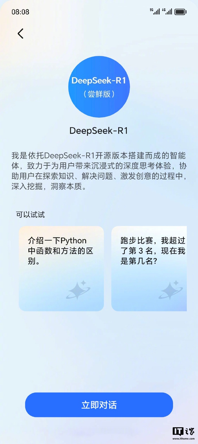IT之家注意到,另一家手机厂商华为已经宣布原生鸿蒙版小艺 App 已经接入 DeepSeek-R1 Beta 版,手机搭载或升级至 HarmonyOS NEXT 版本的用户,将小艺 App 升级到 11.2.10.310 版本及以上,可以通过“小艺 App-发现-智能体”与 DeepSeek 进行对话。