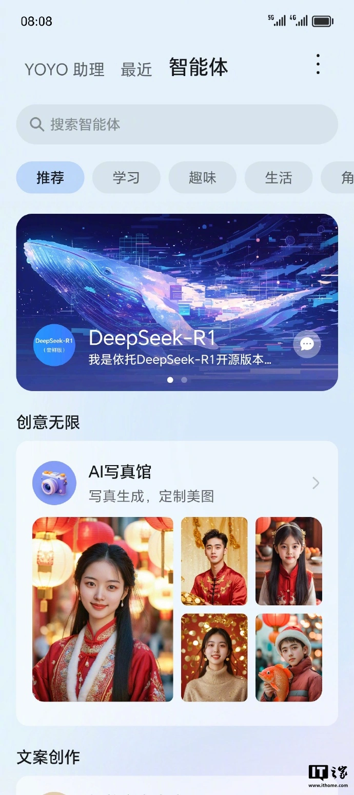想体验这个功能的用户,可以在唤醒 YOYO 后将手机底部往上拉进入“智能体”板块,点击“DeepSeek-R1”即可。