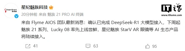 IT之家 2 月 8 日消息,星纪魅族今日宣布,Flyme AIOS 团队确认已完成 DeepSeek-R1 大模型接入,下周起魅族 21 系列、Lucky 08 率先上线尝鲜,星纪魅族 StarV AR 眼镜等 AI 生态产品将陆续接入。