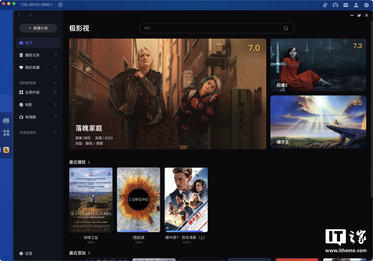 以 PC 端的极空间私有云-极影视为例,T2S 内储存的海量电影都会自动整合在极影视内,比如通过首页置顶新增影视推荐板块,可根据你近期的观影内容,智能推荐出相似类别的影片,整个界面看起来更加高级,美观。