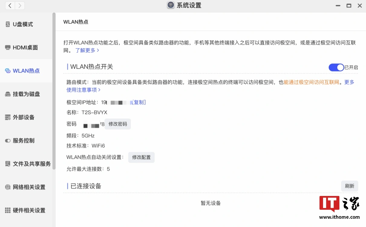极空间私有云 T2S 支持 Wi-Fi / WLAN 热点模式两态切换。