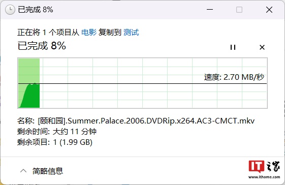 比如下图,笔者在网络并不算流畅的咖啡厅中,将电影复制到本地,只有可怜的 2.7MB/s。