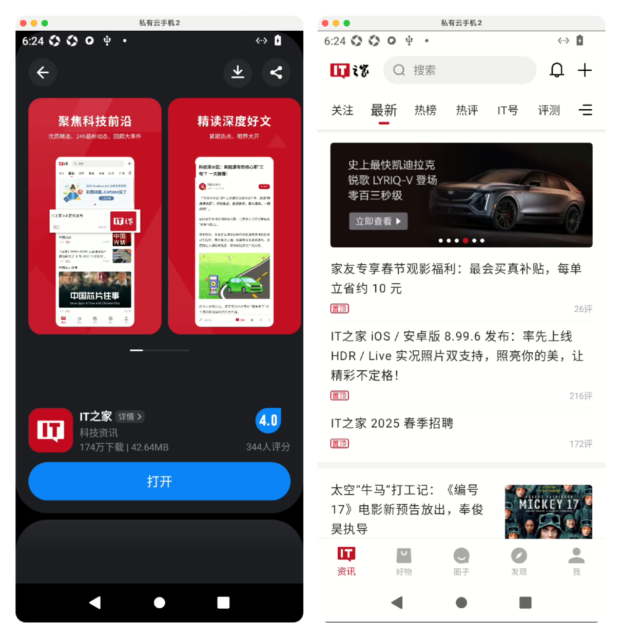 在体验中,云手机的表现还算流畅,像是刷抖音、浏览网页都没啥问题的,玩玩连连看这类小游戏也是没问题的。不过在IT之家的体验中,略有几次卡顿和一两次掉线的问题,这里或许和网络有关。