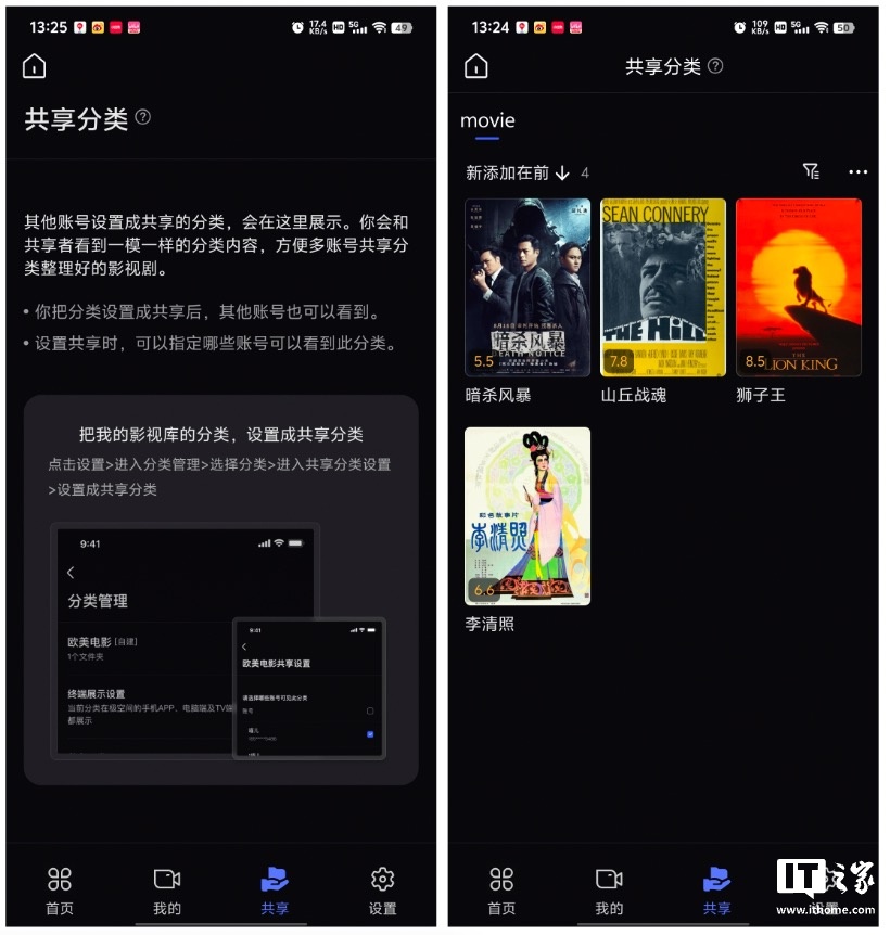 其他账号设置成共享的分类,会在“共享”栏目中展示,你会和共享者看到一模一样的分类内容,方便多账号共享分类整理好的影视剧,相当于是多个成员一起共建家庭影视库,这也是一个很实用的功能。