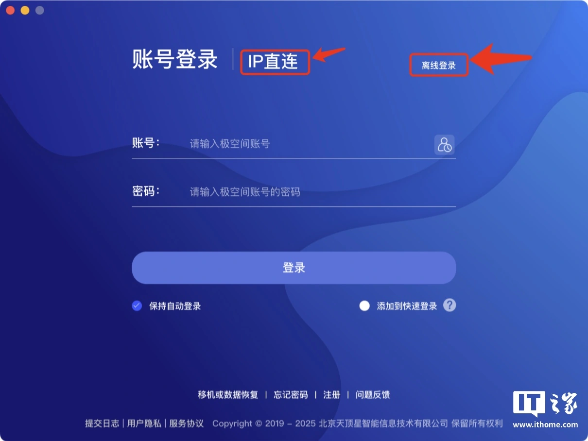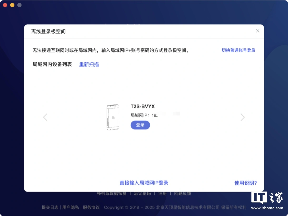 其中,IP 直连需要提前设置好 IP 地址。而离线登录则需要在同一个局域网内。