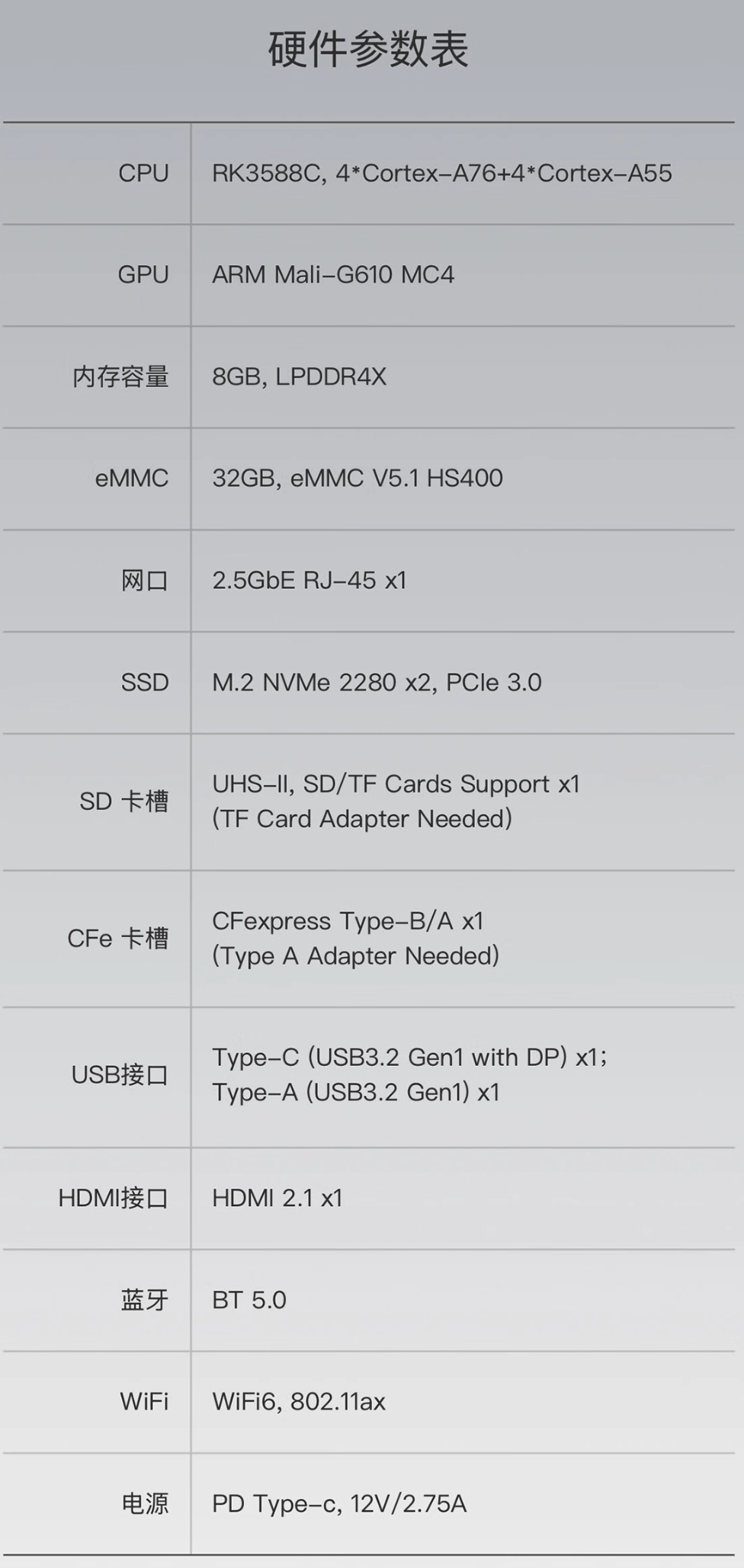 扩展接口方面,除了 2.5G 网络之外,SD、CFe、Type-C、USB、HDMI 都有,前后可以说是塞得满满当当,具体规格大家可以看看下面这张图。