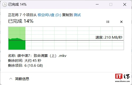 笔者这里选择的是 exFAT 格式,简单测试速度,使用 USB-C 口进行测试,拷贝电影,写入速度在 200MB/s 上下,最高能达到 290MB/s。