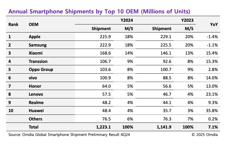 三星在 2024 年第四季度的出货量为 5190 万部,使其 2024 年的总出货量达到 2.23 亿部,比 2023 年下降了 1.1%。除 2024 年第二季度外,三星是 2024 年全年整体出货量下降的少数几家制造商之一。持续下滑的原因是中端智能手机市场需求放缓,因为 A 系列占据了该公司大部分的出货量。