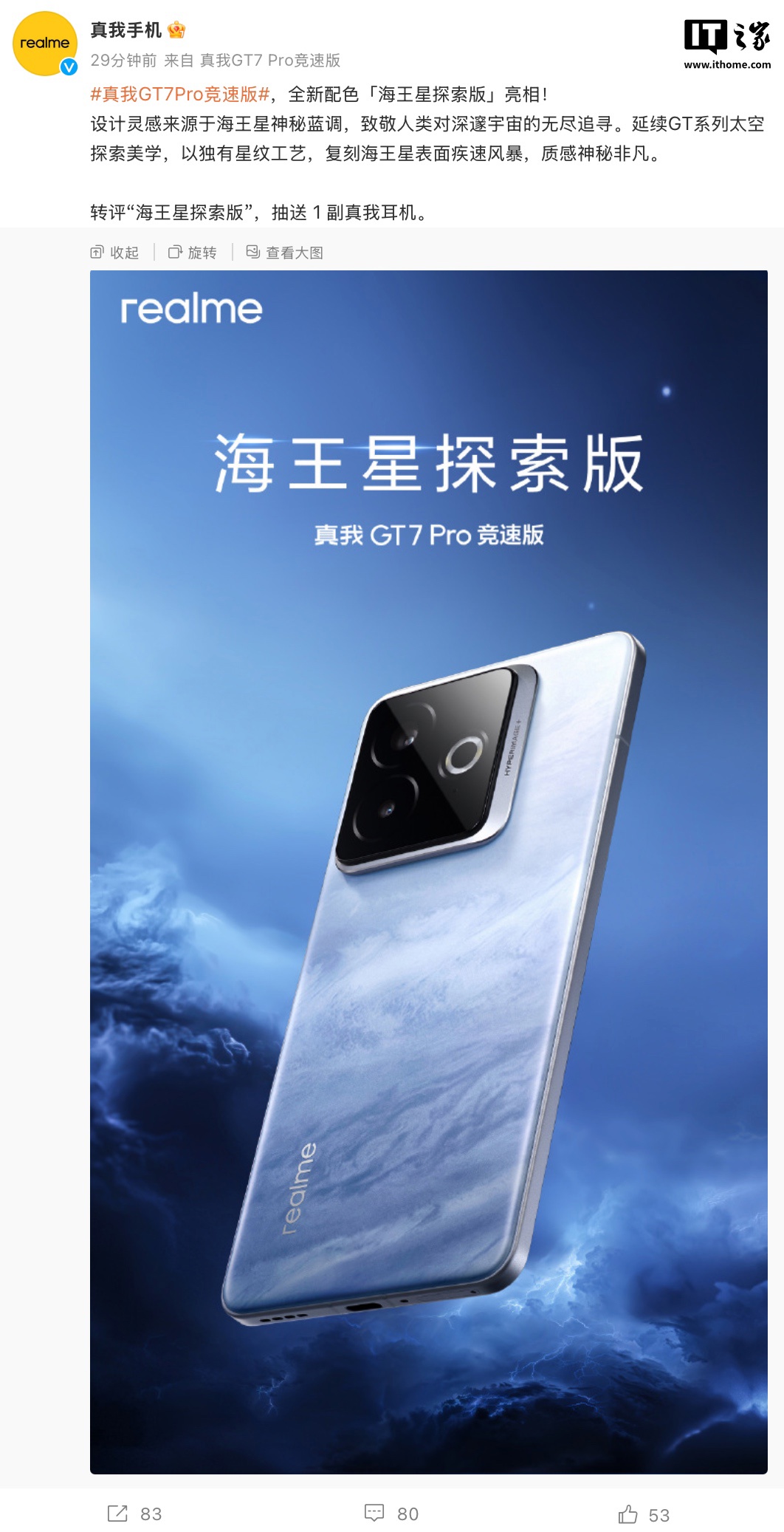 IT之家 2 月 10 日消息,realme 真我手机现已在微博官宣真我 GT7Pro 手机将拥有一款“海王星探索版”配色,号称设计灵感来源于海王星神秘蓝调,引入星纹工艺,拥有“海王星表面疾速风暴”。