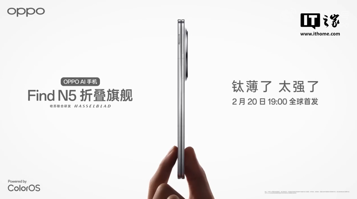 IT之家 2 月 10 日消息,OPPO 官方刚刚放出了 Find N5 折叠屏手机的外观宣传视频,新机将于 2 月 20 日 19:00 全球首发。