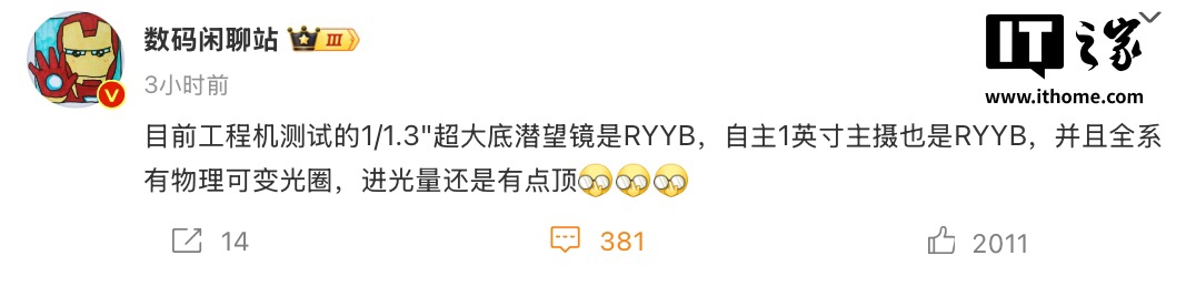 IT之家 2 月 11 日消息,博主 @数码闲聊站 今天透露一款神秘新机的工程机正在测试自主 1 英寸 RYYB 主摄,同时该机也将配备 1/1.3 英寸 RYYB 超大底潜望镜,同时全系机型标配物理可变光圈。