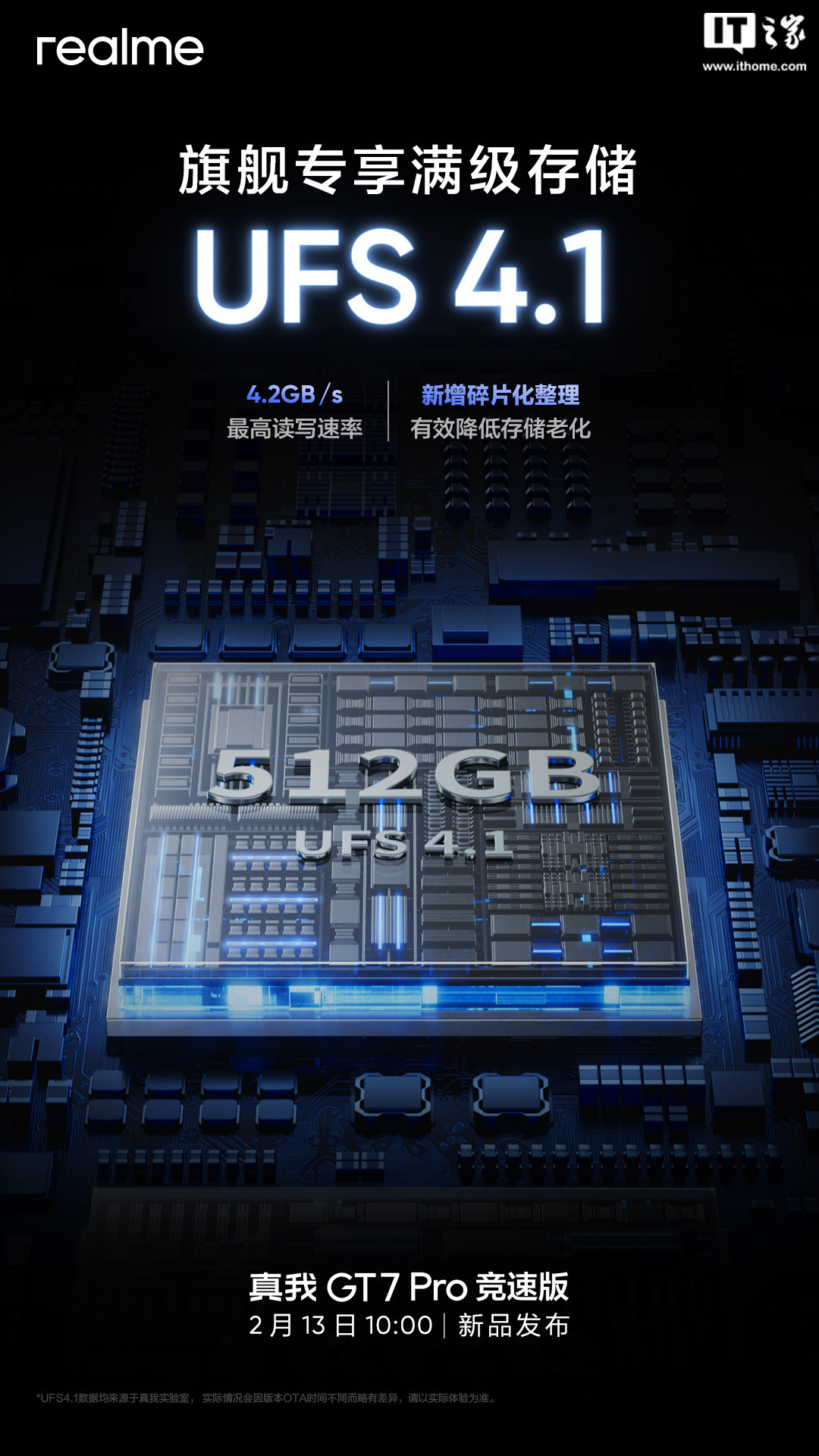 IT之家 2 月 11 日消息,realme 真我 GT7 Pro 竞速版手机「星迹钛」和「海王星探索版」配色已曝光。官方今日继续预热 GT7 Pro 竞速版新机,其确认搭载 UFS 4.1 闪存,最高读写速率 4.2GB/s。