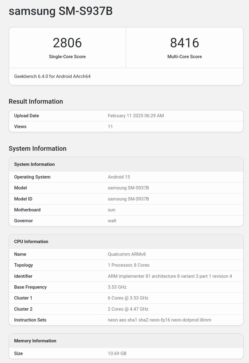 IT之家 2 月 12 日消息,三星最薄旗舰 Galaxy S25 Edge 手机昨日(2 月 11 日)现身 GeekBench 跑分库,6.4.0 版本单核成绩为 2806 分,多核成绩为 8416 分。