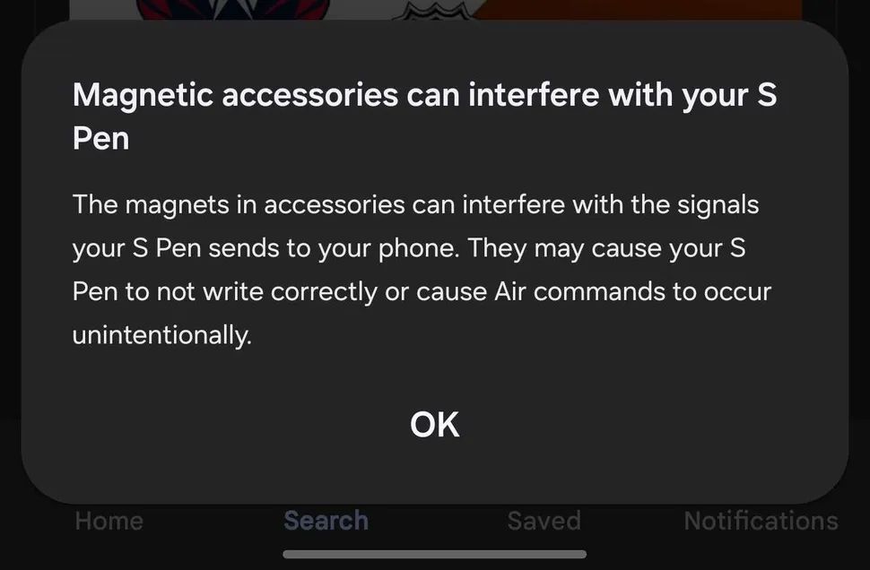 消息源表示这个问题在 Galaxy S24 Ultra 手机上就已存在,磁吸配件中的磁铁会干扰 S Pen 发送给手机的信号,可能导致 S Pen 书写不准或意外触发 Air commands。
