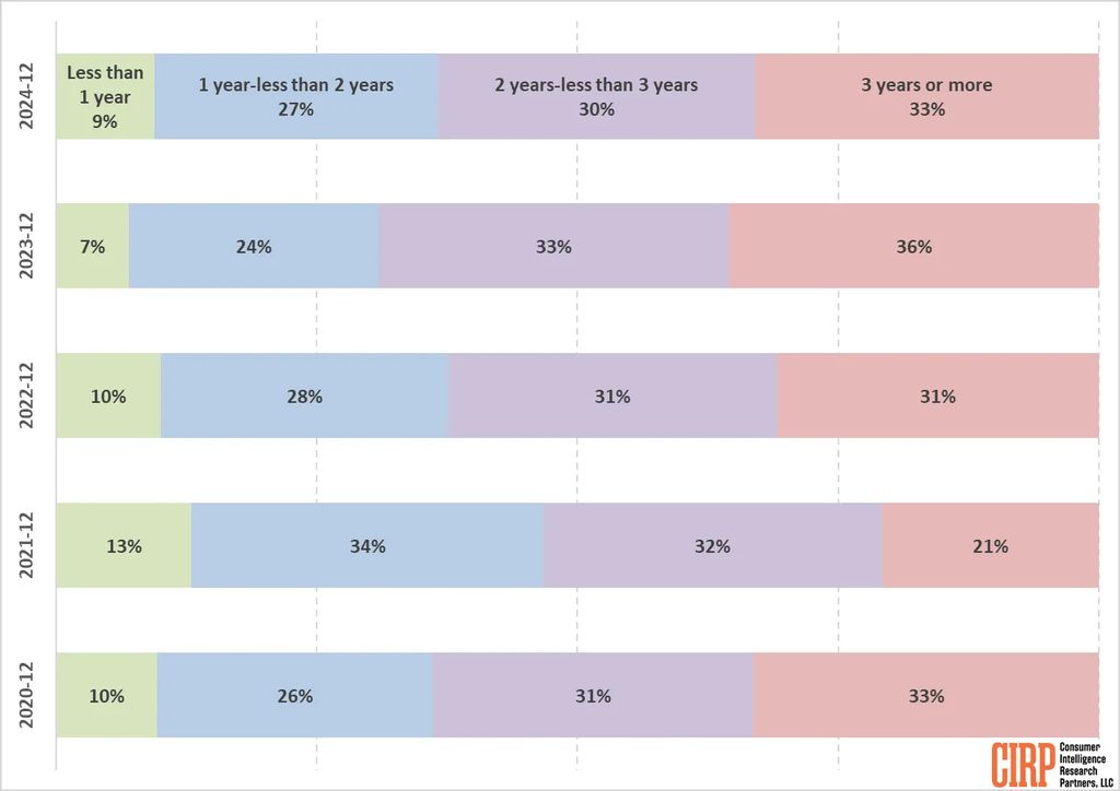 具体来说,2024 年第 4 季度中,36% 的 iPhone 购买者表示距离他们上次换机相隔不到两年,而 2023 年第 4 季度这一比例为 31%。