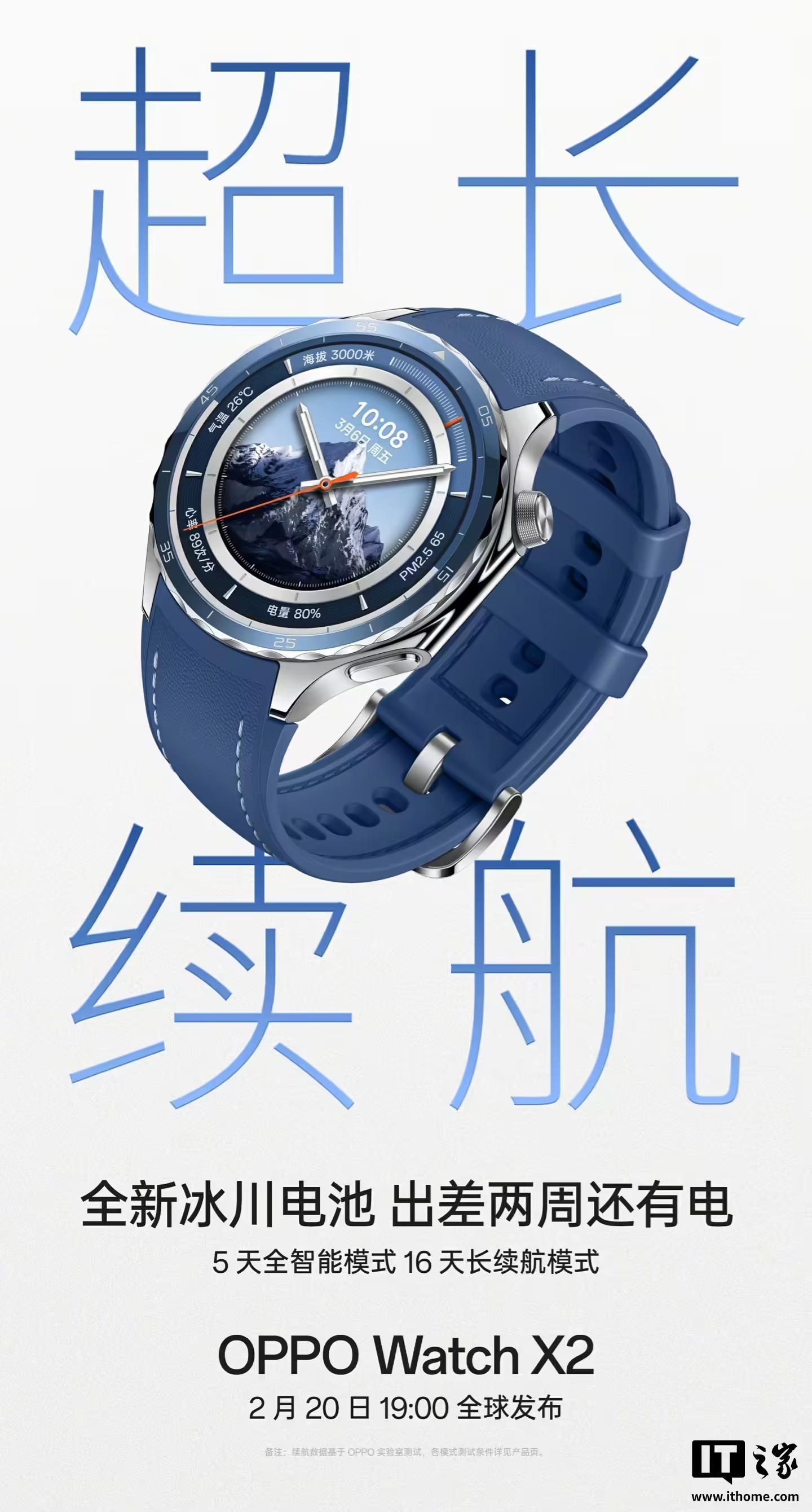 据IT之家此前报道,OPPO Watch X2 智能手表内置全新冰川电池,宣称“出差两周还有电”:5 天全智能模式、16 天长续航模式。新表还支持双频全星座 GPS 户外跑步记录 / 地图导航功能,宣称续航时间分别为 26 小时、24 小时。