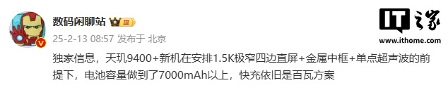 IT之家 2 月 13 日消息,博主 @数码闲聊站 今日爆料称,天玑 9400 + 新机在安排 1.5K 极窄四边直屏 + 金属中框 + 单点超声波的前提下,电池容量做到了 7000mAh 以上,快充依旧是百瓦方案。
