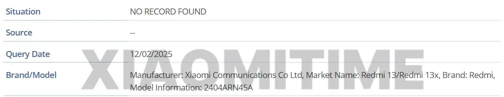 IT之家 2 月 13 日消息,科技媒体 xiaomitime 昨日(2 月 12 日)发布博文,通过挖掘 GSMA IMEI 数据库,发现了小米 REDMI 13X 手机的踪迹,型号为 2404ARN45A。