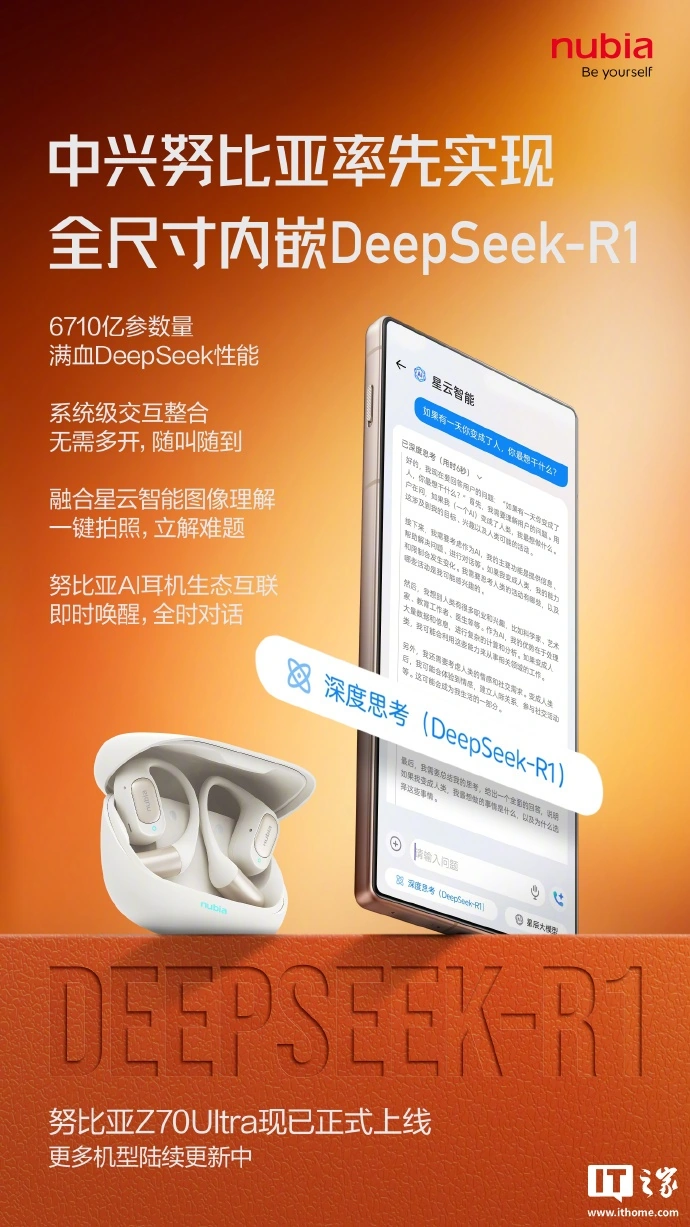 IT之家 2 月 13 日消息,中兴努比亚今日宣布率先实现全尺寸内嵌 DeepSeek,努比亚 Z70 Ultra 也将作为全球首款全尺寸内嵌 DeepSeek 的机型今日正式上线,更多机型陆续更新中。